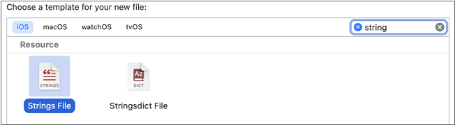 화면에 보이는 템플릿 중에서 'Strings File'을 선택합니다.