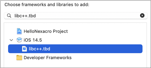 하단에 있는 + 버튼을 클릭해 "libc++.tbd" 항목을 추가합니다.