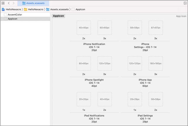 Xcode의 템플릿으로 생성한 프로젝트에는 리소스를 관리하는데 필요한 빈 애셋 카탈로그(Asset Catalog)가 포함됩니다. 사용자는 필요에 따라 앱 아이콘, 런처 이미지 등을 애셋 카탈로그에 등록하여 사용할 수 있습니다.