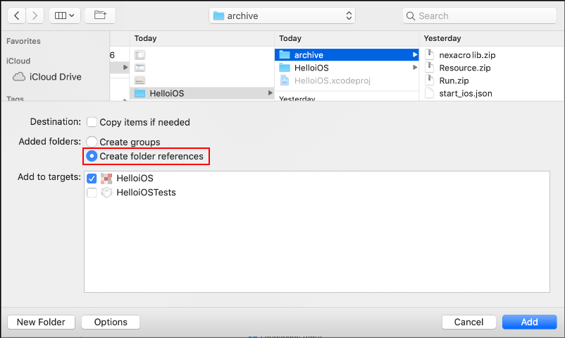 archive 폴더를 선택하고 폴더 추가 옵션에서 "Create folder references"을 선택 후 Add 버튼을 클릭합니다.