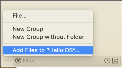 Xcode의 프로젝트 탐색기 하단의 + 버튼을 클릭하여 [Add Files to "프로젝트명"]을 선택합니다.
