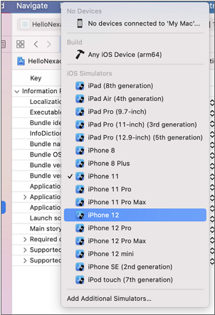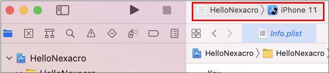 1. Xcode 상단의 Target Name을 클릭하여 다음과 같이 앱을 구동시킬 iOS 단말기 혹은 시뮬레이터를 선택합니다.
