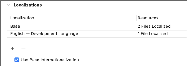 영어 이외의 언어를 지원하려면 [프로젝트 > Info > Localizations]에서 + 버튼을 눌러 다른 언어를 추가할 수 있습니다.