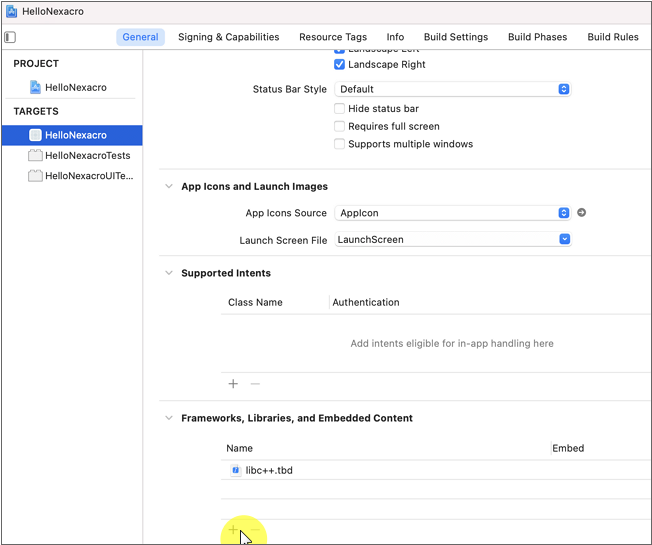 iOS 프로젝트에서 넥사크로에 최적화된 환경을 만들기 위해 추가로 제공되는 넥사크로 라이브러리 파일을 설정합니다.