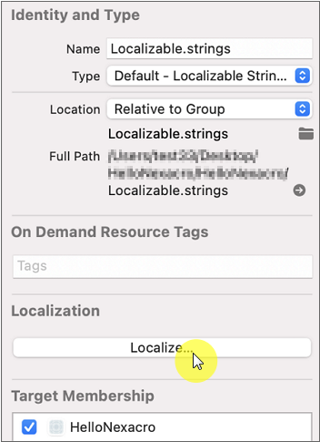 Xcode 화면 오른쪽에 있는 Utilities 창에서 'Localize...' 버튼을 클릭하고 언어를 선택합니다. 사전에 프로젝트 설정에서 언어를 추가하지 않은 경우에는 기본으로 영어가 선택됩니다.