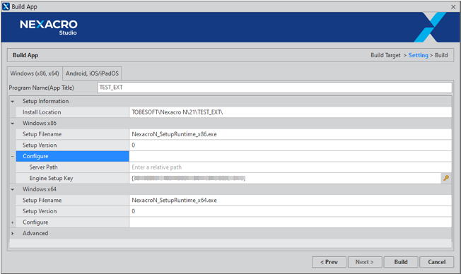 Build Target 항목 중 Windows 운영체제를 선택한 경우에 Setup 관련 설정을 확인하고 [Build] 버튼을 클릭합니다.
