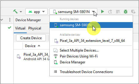 Select a virtual device or connected device from the device list at the top of Android Studio and execute Run.