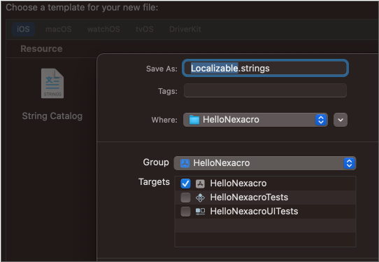 In the "Save As" field, make sure the file is named "Localizable.strings."