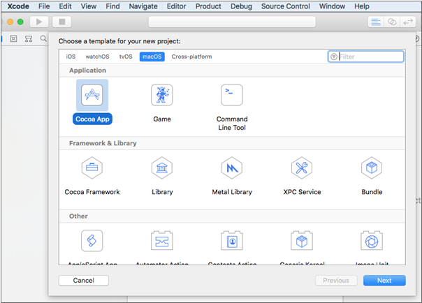 프로젝트 생성을 위한 템플릿 화면에서 'Cocoa App' 항목을 선택합니다.