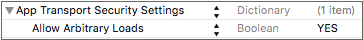 Allow Arbitrary Loads 항목값을 "YES"로 설정하지 않으면 WebBrowser 컴포넌트가 화면에 표시되지 않습니다.