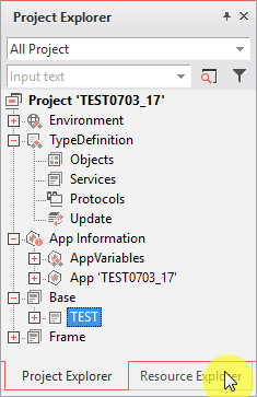 nexacro studioのProject Explorerウィンドウにて、下部のResource Explorerタブをクリックします。