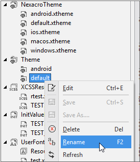 Themeフォルダの下にdefault.xthemeファイルがコピーされました。そのまま使っても構いませんが、デフォルトテーマとファイル名が同じであれば混乱することがありますので、テーマ名を変更します。マウスの右ボタンをクリックし、コンテキストメニューから「Rename」項目を選択して、「test」に変更します。