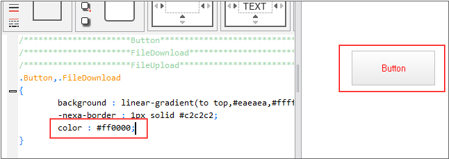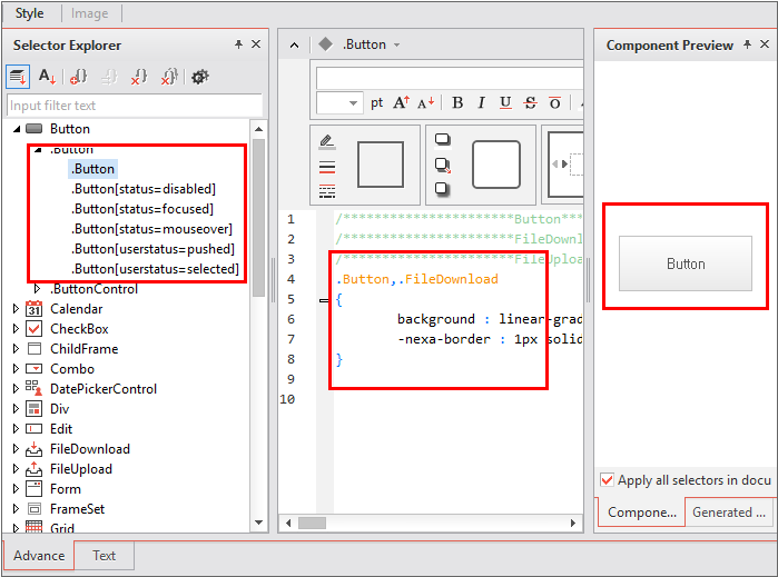 【Nexacro Style Sheet]項目からButtonをダブルクリックします。【Xcss Editor]には.Buttonのコードが表示され、[Preview]にはButtonコンポーネントのプレビュー画面が表示されます。