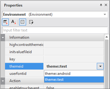 [Project Explorer]に戻って、「Environment」項目を選択し、プロパティウィンドウのthemeidプロパティ値をThemeフォルダの下にコピーしたテーマに変更します。