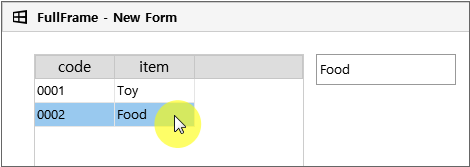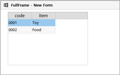 変更された内容を保存して、ツールバーの[QuickView]項目を選択します。nexacroブラウザが実行されて、画面にGridコンポーネントとEditコンポーネントが表示され、バインドされた値を確認することができます。行(Row)の情報を変更していなかったので最初の行(Row)が選択されており、Editコンポーネントには、「Toy」が表示されます。