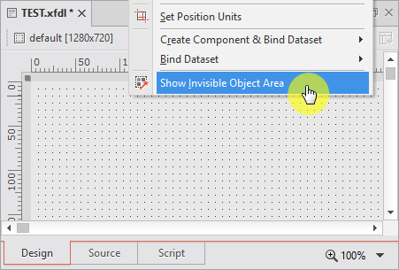 「Invisible Object」領域が表示されない場合は、デザイン画面上でマウスの右ボタンをクリックした後に表示されるコンテキストメニューから「Show Invisible Object Area」項目を選択します。