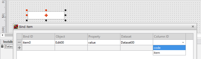 Editコンポーネント上で押し続けていたマウスの左ボタンを離すと、[Bind Item]設定画面が表示されます。[Bind Item]設定画面では、EditコンポーネントでバインドするプロパティとDatasetオブジェクトでバインドする列を選択します。