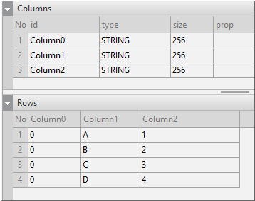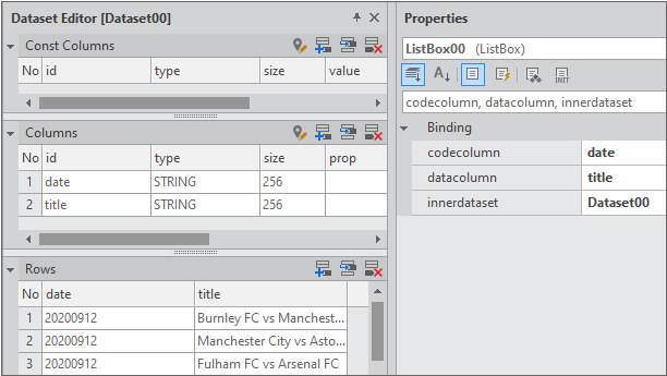 Enter the data item list in the created Dataset. If you double-click Dataset in the Invisible Objects area, then the Dataset Editor appears. Enter Columns and Rows as shown in the figure below.