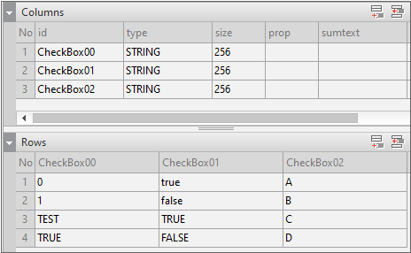 When you select the value in the Grid component, the corresponding value is reflected in the CheckBox component. In CheckBox02, the truevalue property value is set to "A" and the falsevalue property value is set to "B".