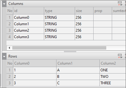 Enter the data item list in the created Dataset. If you double-click Dataset00 in the Invisible Objects area, then the Dataset Editor appears. Enter Columns and Rows as shown in the figure below.