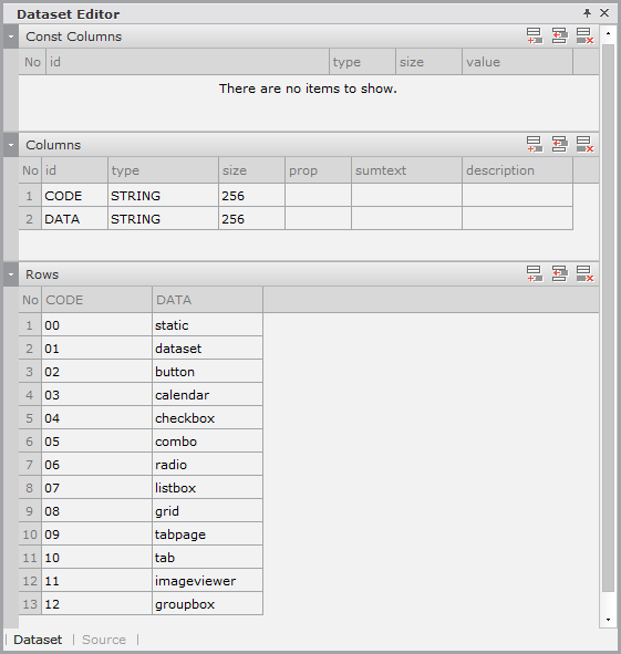 Add the Dataset object and enter the Column, Row information as follows. Then, select the Dataset object and bind it with the Grid component by dragging and dropping.