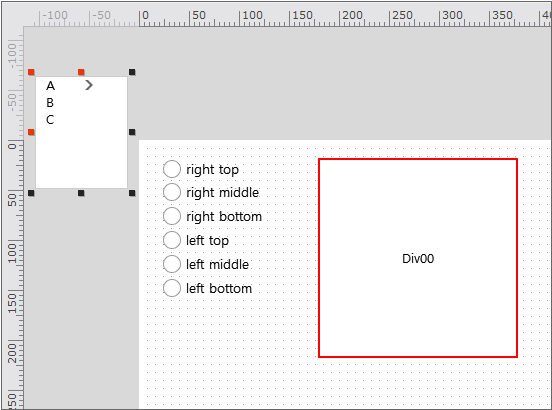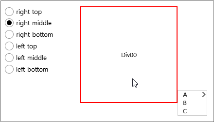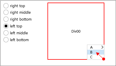 Specifies the horizontal and vertical sorting method of the pop-up menu at the coordinate points showing the pop-up menu. The default value is "right bottom". At this time, the direction to be used should be considered based on the coordinate point. If the coordinate point is the lower right vertex of the Div component, then the default sorting value is applied and the pop-up menu appears at the lower right of the vertex. Conversely, if the sorting value is set to "left top", then the pop-up menu appears inside the Div component as shown below.