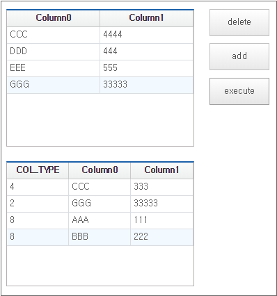 Clicking the [delete] button deletes the Row information. You can add Row by clicking the [add] button. You can edit the contents by selecting each cell. Information added, deleted, or modified in this way is displayed in the Grid component below when you click the [execute] button.