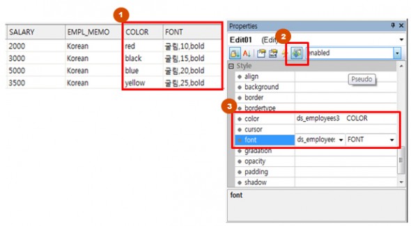 It is a binding technique for giving style to the data output to the component. This is the case when the style property value of the component is entered in the Dataset as shown on the left of the figure below and then bound to the style property of the component.