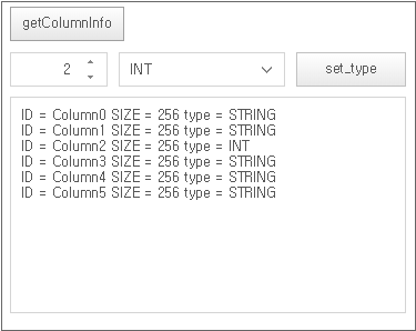 Clicking the [getColumnInfo] button displays the column information of the Dataset object in the TextArea component. Select the column index you want to change, select the type property value, and click the [set_type] button to change the column type property value. You can check the changed information by clicking the [getColumnInfo] button.