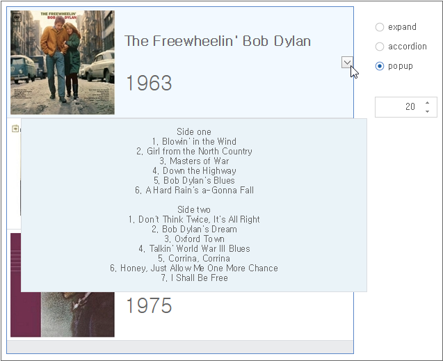 The album information is displayed. Clicking the right button displays the songs in the album. When the Radio component is selected, the bandexpandtype property value is changed, and when the number of the Spin component is changed, it is reflected as the bandindentsize property value.