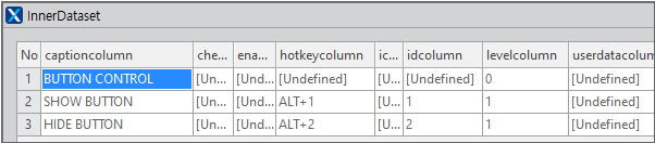 Menu 컴포넌트에서 별도 Dataset 오브젝트를 사용하지 않고 innerdataset 편집창을 사용한다면 자동으로 칼럼항목을 생성하고 Menu 컴포넌트의 관련 속성값(captioncolumn, checkboxcolumn 등)도 지정합니다.