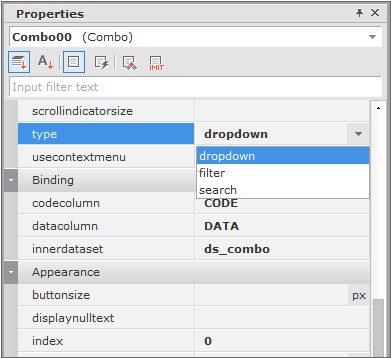 Combo의 type 속성을 설정하면 아이템을 직접 선택하는 방법 외에 검색어를 입력하여 목록에서 아이템을 검색하고, 선택하는 기능을 구현할 수 있습니다. 예를 들어, 속성값을 'filter'나 'filterlike'로 설정하면 포털 사이트에서 제공하는 자동완성 기능과 유사한 효과를 보여줄 수 있습니다.