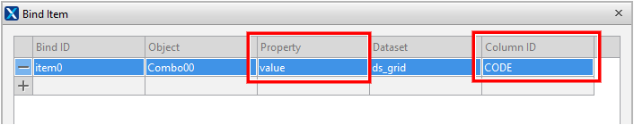 Invisible Objects 영역에 있는 Dataset 오브젝트(ds_grid)을 폼에 배치한 Combo 컴포넌트로 드래그 앤 드롭하고 [Bind With "ds_grid"]을 선택하면 아래와 같이 Bind Item 창이 뜹니다. Bind Item 창에서 속성 항목과 칼럼 ID 항목을 수정합니다.