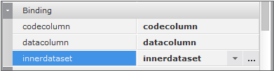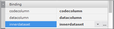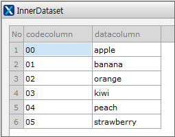 단계 1에서 생성한 Combo를 선택한 후 Properties 창에서 innerdataset 속성을 찾습니다. innerdataset 속성을 선택하면 아래와 같이 속성 옆에 [...] 버튼이 나타나고 그 버튼을 클릭하면 다음과 같이 InnerDataset 편집기가 나타납니다. 편집기에는 아래와 같이 입력하고 [OK] 버튼을 클릭하면 바인딩이 완료됩니다.