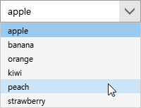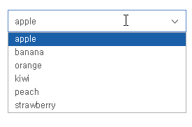 콤보 에디트에 apple이 초기값으로 선택되어 있는지 확인하고 드롭 버튼을 눌러 목록에서 다른 아이템을 선택하여 해당 값으로 값이 변경되는지 확인합니다.