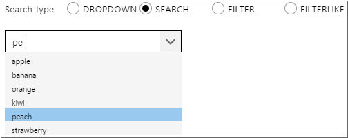 다음은 라디오 버튼으로 Combo의 type 속성 중 하나를 선택하면 해당 타입으로 Combo가 동작하는 예제입니다. 설정할 수 있는 타입은 dropdown, search, filter, filterlike 입니다.