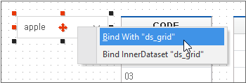 Dataset 오브젝트를 마우스 왼쪽 버튼으로 누른 상태로 드래그해서 Grid 컴포넌트 위로 가져가면 바인딩 작업이 처리됩니다. 첫번째 Grid 컴포넌트는 바인딩까지만 처리하고 두번째 Grid 컴포넌트는 해당 CODE 값을 텍스트로 보여주도록 수정합니다. Grid 컴포넌트를 더블클릭해서 Grid Contents Editor를 실행하고 아래 속성값을 수정합니다.