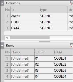 codecolumn에 'CODE'를 datacolumn에 'DATA'를 입력 혹은 선택하고 [OK] 버튼을 클릭하면 바인딩이 완료됩니다. 이 예제는 설정에 대한 이해가 쉽도록 데이터셋의 칼럼 이름을 CODE와 DATA로 하였습니다.