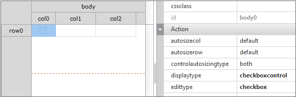 첫번째 칼럼 Cell 오브젝트의 displaytype, edittype 속성값을 아래와 같이 수정합니다.