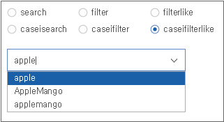 Radio 컴포넌트에서 선택하는 항목에 따라 대소문자 구분 여부를 선택할 수 있습니다. "search", "filter", "filterlike"는 대소문자를 구분해서 입력한 항목 그대로 처리하고 "caseisearch", "caseifilter", "caseifilterlike"는 대소문자 구분없이 처리합니다.