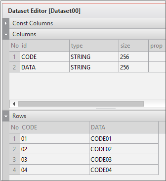 생성한 Dataset에 아이템 정보를 입력합니다. Invisible Objects 영역에 있는 Dataset00을 더블 클릭하면 Dataset 편집기가 뜨는데 아래와 같이 입력합니다. 입력이 완료되면 Dataset 편집기 창을 닫습니다. 창을 닫으면 작업 내용은 자동으로 저장됩니다.