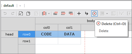 Grid 컴포넌트에 생성된 Dataset 오브젝트를 바인딩합니다. Grid 컴포넌트에서는 head 영역이 보이지 않도록 합니다. Grid Contents Editor를 실행한 후 head row를 선택하고 Delete 버튼을 클릭합니다.