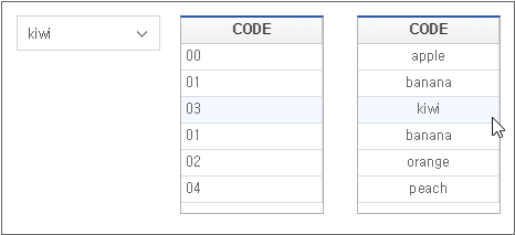 Dataset 컴포넌트를 바인딩해서 목록을 보여주고 있기 때문에 Grid 컴포넌트를 표시할 때 같은 데이터를 공유할 수 있습니다. 오른쪽에 배치한 Grid 컴포넌트는 00부터 05까지 코드만 가지고 있는데 Combo 컴포넌트에 바인딩된 Dataset의 정보를 가지고 텍스트 형태로 데이터를 보여줍니다. 또한 Combo 컴포넌트의 value 속성값을 Grid 컴포넌트에 바인딩된 Dataset 오브젝트와 바인딩해서 Grid 컴포넌트에서 선택한 항목을 Combo 컴포넌트에서 보여주고 Combo 컴포넌트에서 선택한 값을 Grid 컴포넌트에 업데이트합니다.