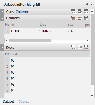 Combo 컴포넌트 옆에 예제와 같이 2개의 Grid 컴포넌트를 배치합니다. 그리고 Dataset 오브젝트를 하나 더 생성합니다. Dataset 오브젝트 생성 정보는 아래와 같습니다. 데이터는 00~05 사이의 값을 임의로 입력합니다.