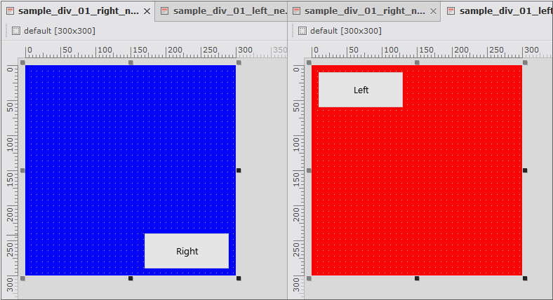 Form을 새로 만들고 Button 컴포넌트를 배치합니다. Form의 width, height 속성값은 300으로 지정합니다. 메인 화면에서 "left top red" 버튼 클릭 시 보일 화면은 Button 컴포넌트를 왼쪽 상단에 배치하고 Form의 background 속성값을 "red"로 지정합니다. 메인 화면에서 "right bottom blue" 버튼 클릭 시 보일 화면은 Button 컴포넌트를 오른쪽 하단에 배치하고 Form의 background 속성값을 "blue"로 지정합니다.