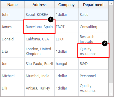 새로 추가된 head row에서 Address, Company Column 밑의 cell을 각각 선택하여 text 속성에 EMail, Department라고 입력합니다.
