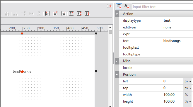 ListView Contents Editor 상단 툴바에서 [Append Detail] 항목을 선택하고 Detail 밴드를 추가합니다. Detail 밴드의 height 속성값은 250으로 지정하고 Detail 밴드 편집 모드로 전환합니다. 셀을 하나 추가하고 셀 속성을 아래와 같이 지정합니다.