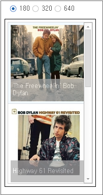 앨범 정보를 표시합니다. body 영역을 클릭하면 해당 앨범 수록곡(상세 데이터)을 표시합니다. body 영역을 다시 클릭하거나 detail 영역을 클릭하면 상세 데이터 표시 영역을 감춥니다.