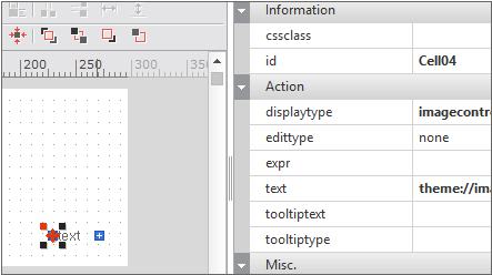 4개의 칼럼 데이터 외에 버튼 기능을 할 셀 2개를 추가합니다. displaytype 속성값은 "imagecontrol"으로 지정하고 text 속성값에 표시할 이미지 경로를 지정합니다. 예제에서는 테마에 있는 이미지를 사용했습니다. 해당 셀을 사용자가 클릭했을때 이벤트를 처리하기 위해서는 셀 id 값을 알아야 합니다. 셀을 선택하고 속성창에서 id 속성값을 확인하거나 수정할 수 있습니다.