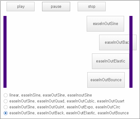 Apply animation effects to the Button00, Button01, Button02, Button03 components. When the [play] button is clicked, the animation effect is executed, and when the [pause] button is clicked, the animation effect is paused. Clicking the [stop] button returns to the initial state. Selecting the Radio button at the bottom changes the easing property value and the text of the Button component.